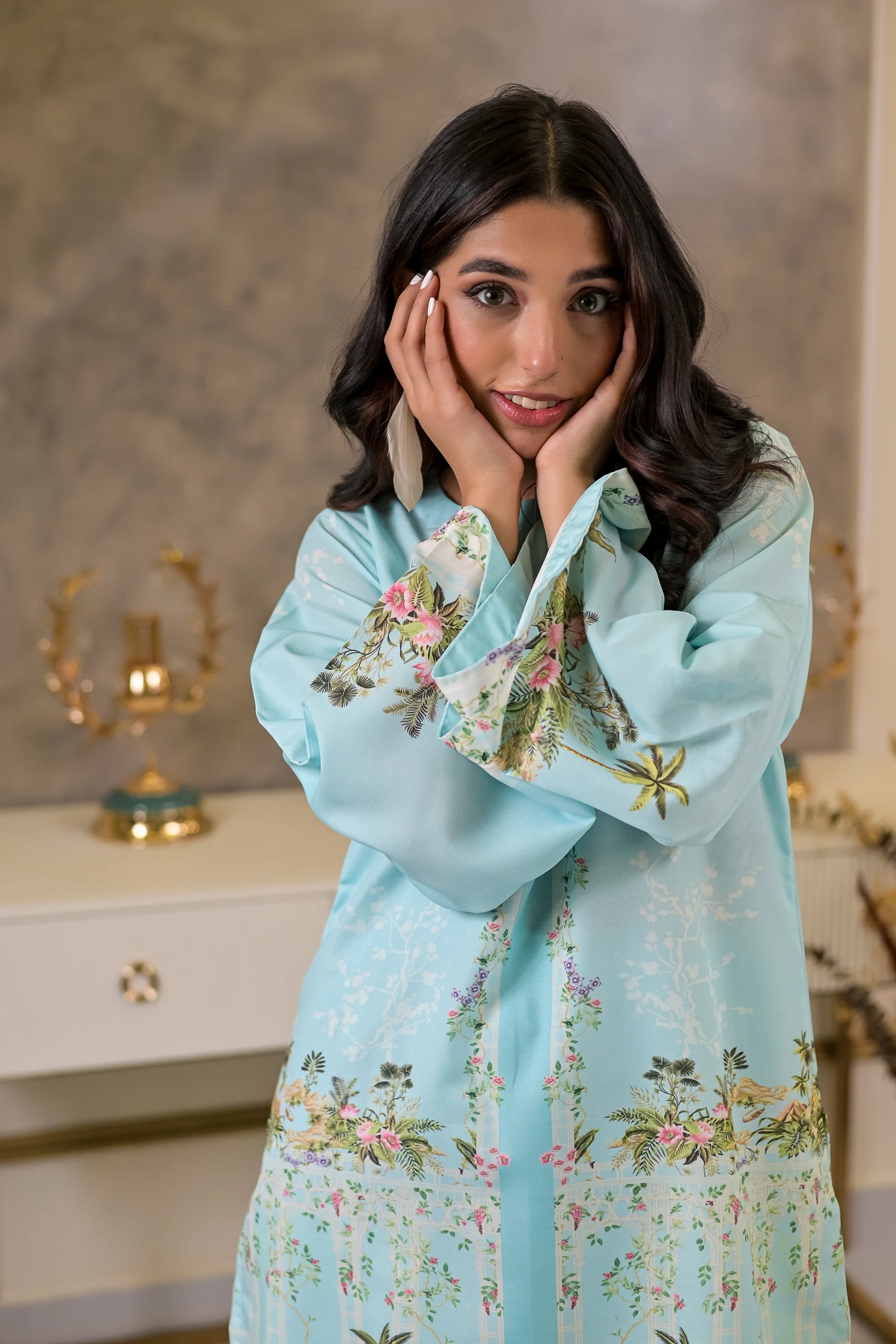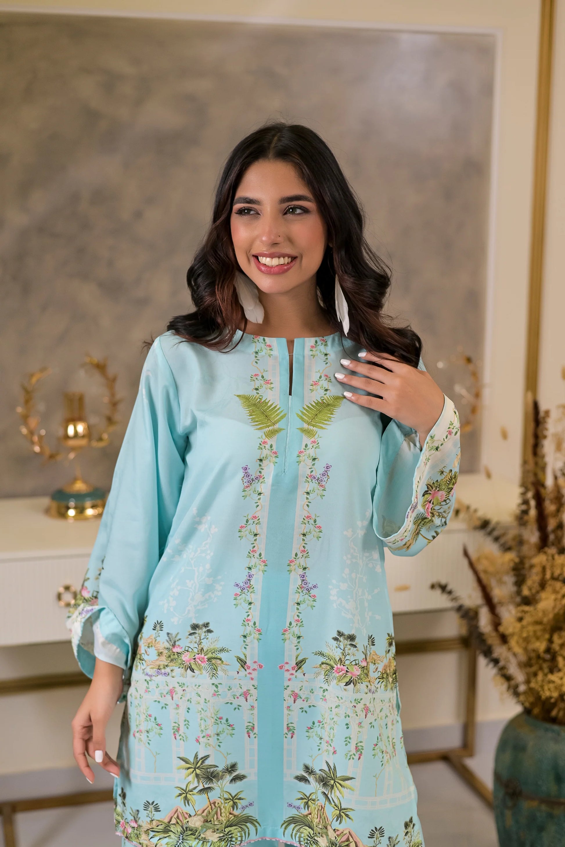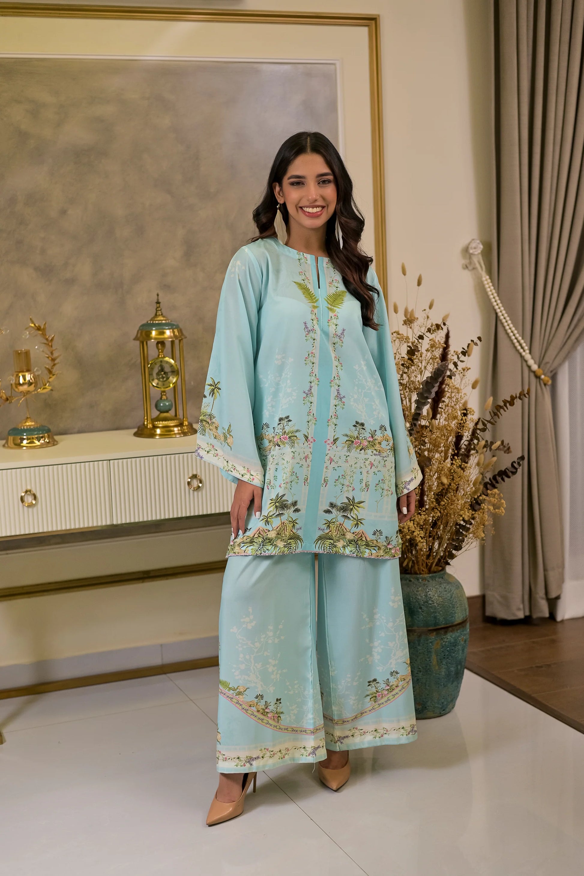 Azure Peace embodies calm sophistication with its soft aqua-blue base accented by delicate, nature-inspired prints. Tailored from lightweight blended crepe silk, this 2-piece stitched set features a straight-cut shirt with full sleeves and matching trousers, both highlighted with subtle detailing along the borders. Fresh, graceful, and uplifting—perfect for daytime wear that feels as serene as it looks.
