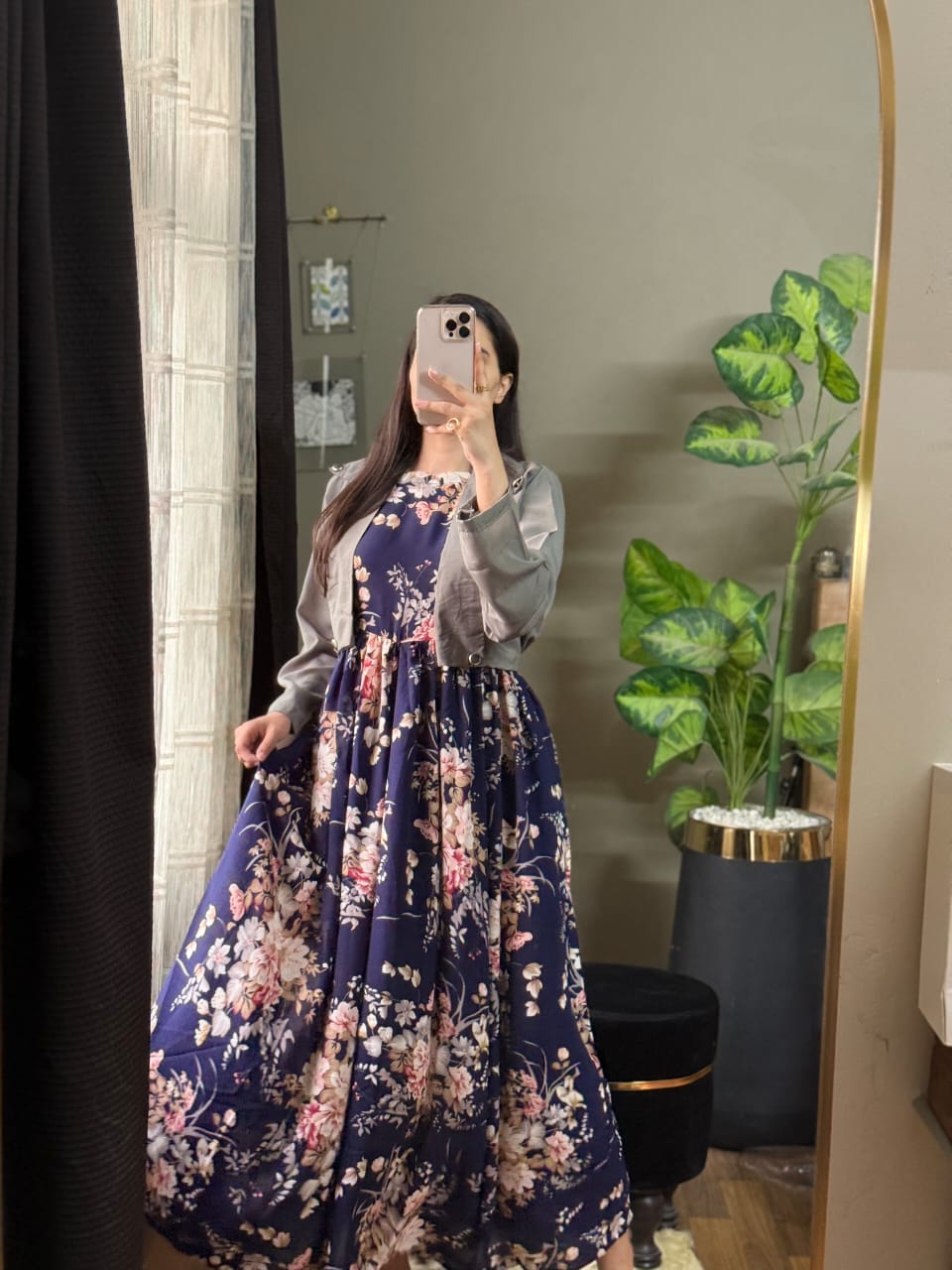 The Coat Maxi, made from soft georgette, features full sleeves coat, side adjustable belt, and, sleeveless frock design with refined details Black floral dress with Gray top.