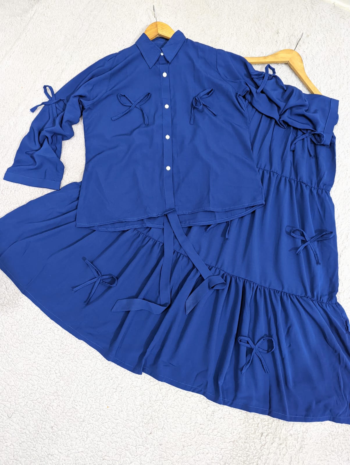 Elevate your style with our stunning Deep Teal 2-Piece Co-ord Set. This set perfectly blends sophisticated tailoring with feminine details. Featuring a classic button-down shirt and a flowing tiered skirt, the entire outfit is adorned with delicate, hand-tied matching bows for a trendy "Coquette" aesthetic.