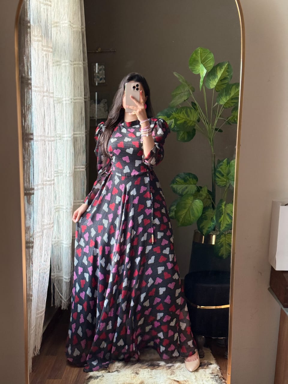 This Fairy Fantasy gown showcases a high collar and full-length sleeves, featuring a cinched detail that elegantly defines the waist. Designed with expert craftsmanship, it offers a graceful and ethereal look ideal for formal events or themed occasions, blending timeless style with a touch of fantasy.
