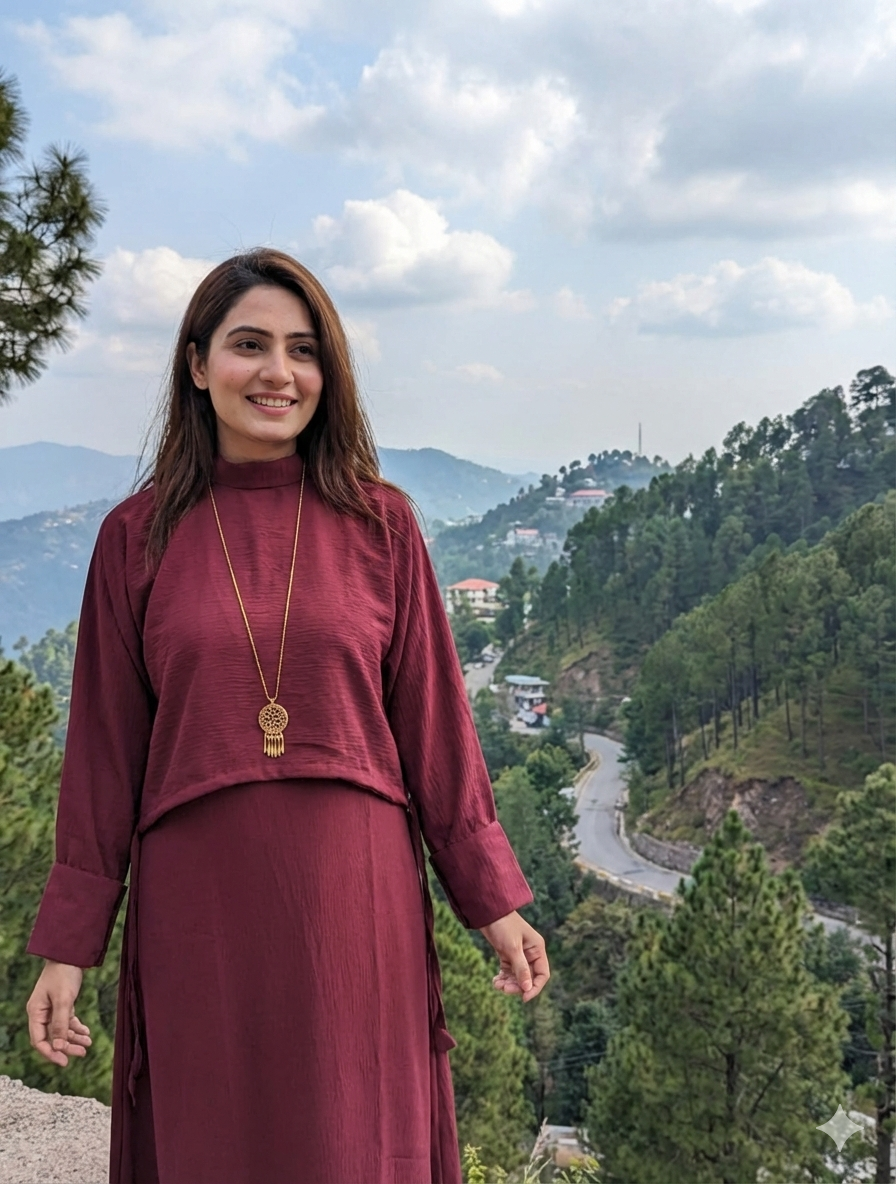 This elegant layered maxi dress is designed for a modern yet graceful look. The outfit features a sleeveless long maxi paired with a stylish short high-neck top, creating a refined layered silhouette