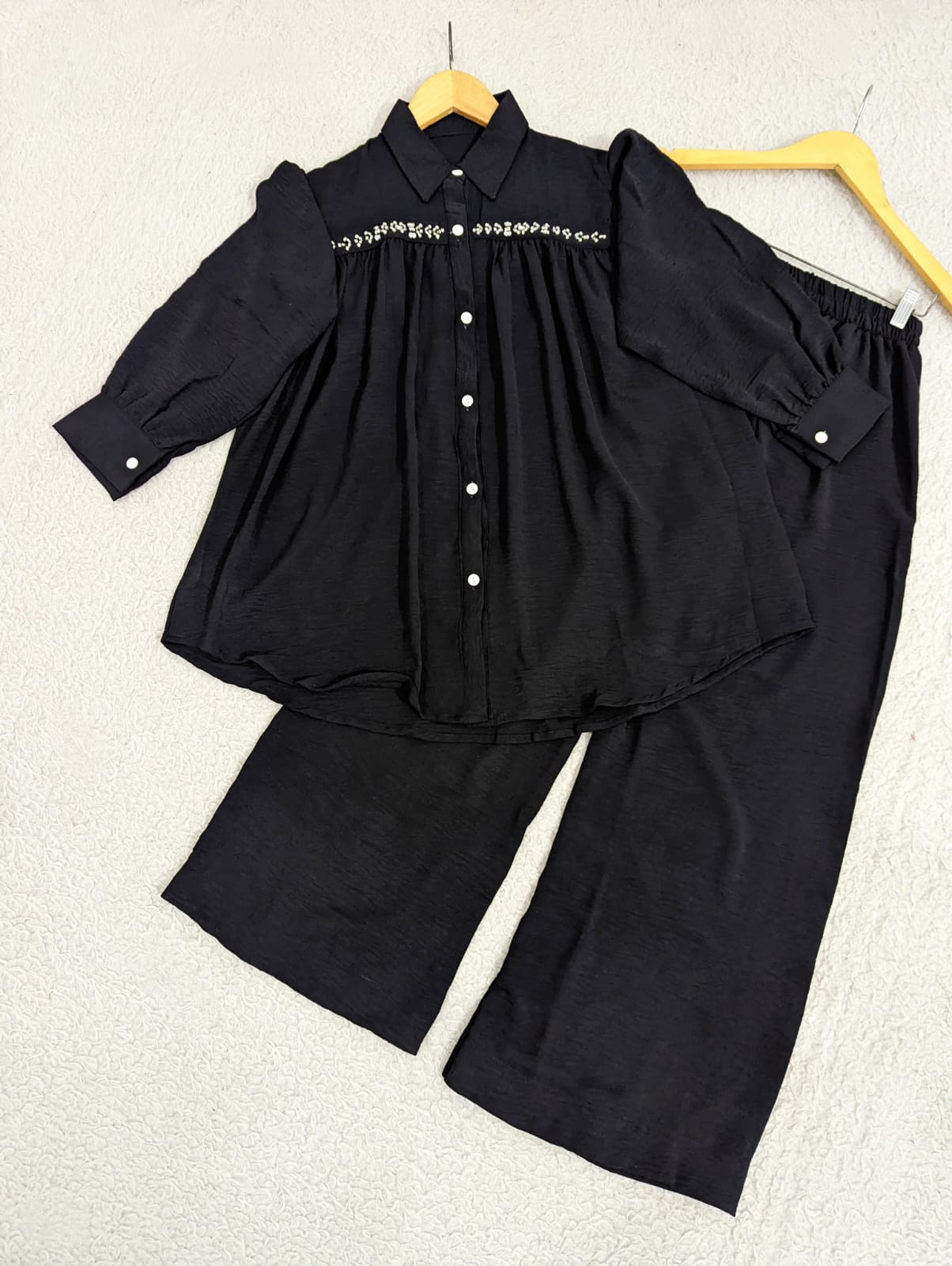 Hand-embellished button-down co-ord set crafted from imported georgette fabric. This sophisticated two-piece ensemble features delicate embroidery detailing that adds elegance to your wardrobe. The breathable georgette material ensures comfort throughout the day, while the coordinated design offers versatile styling options. Perfect for casual outings, gatherings, or elevated everyday wear. The button-down silhouette provides a polished, put-together look with effortless grace.
