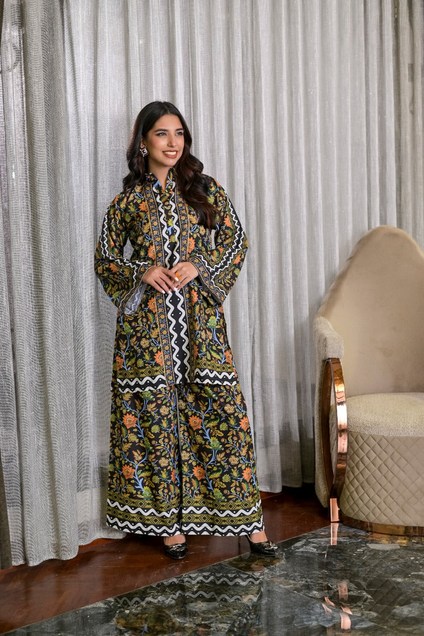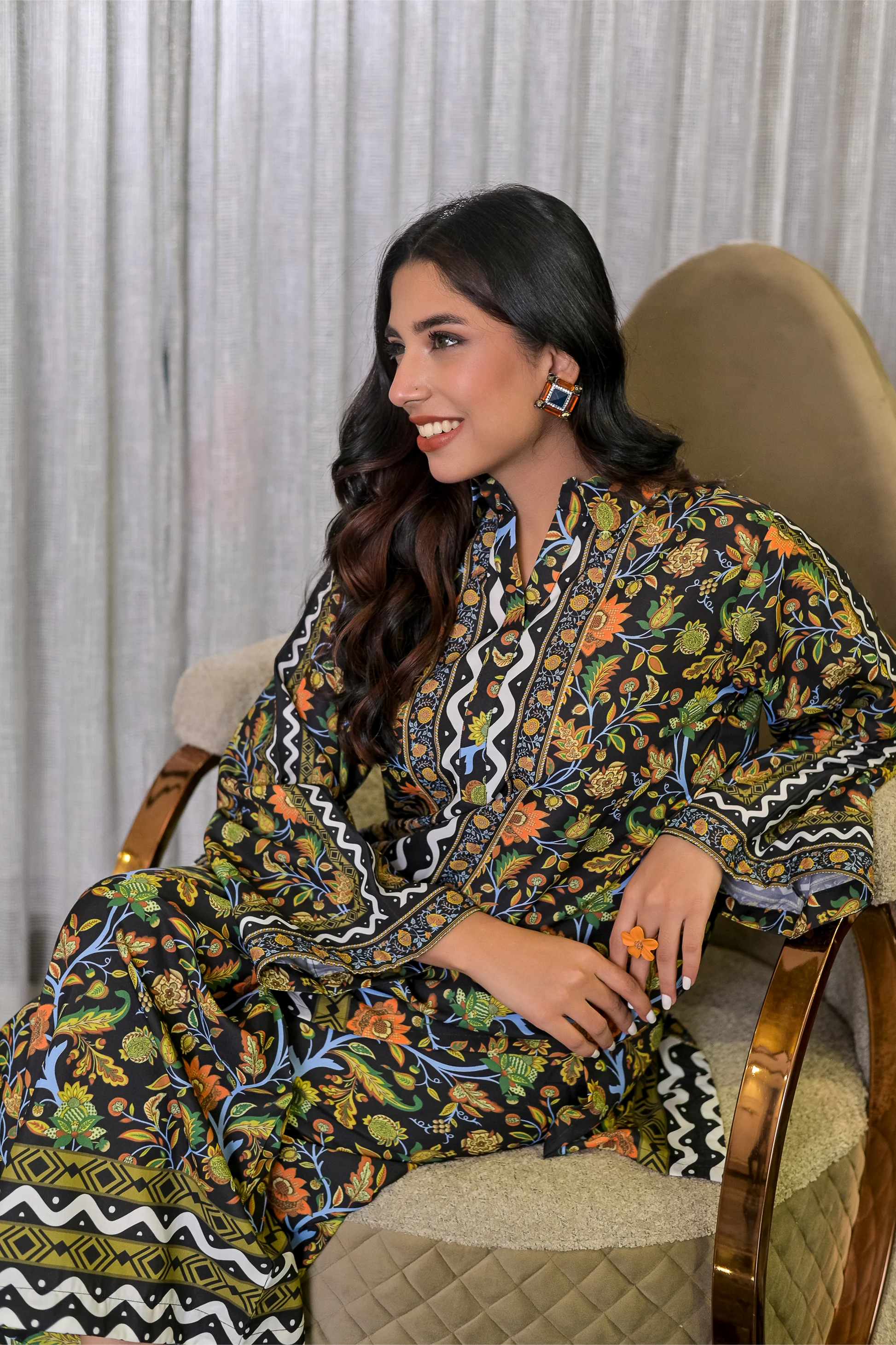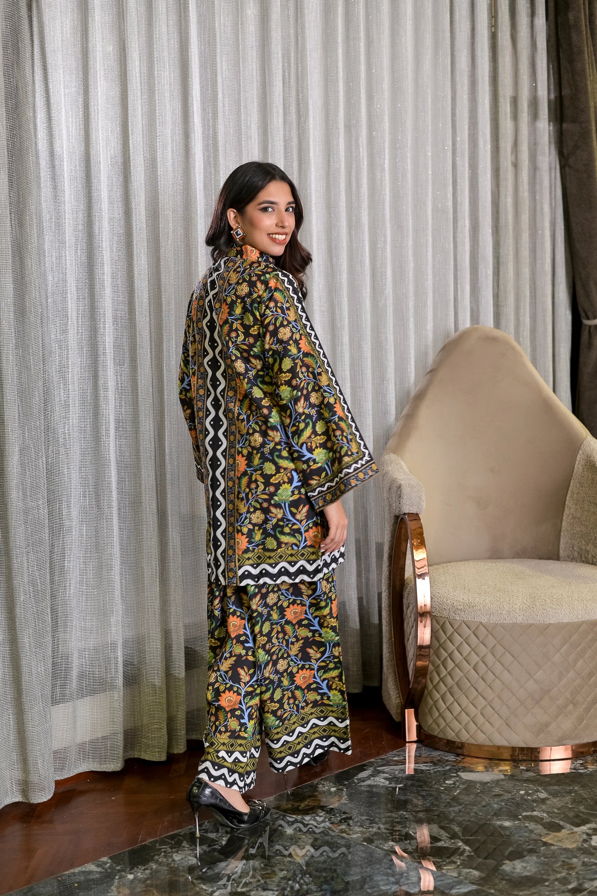 Melanite is a striking fusion of bold and vibrant hues, set against a deep black base with intricate accents of orange, green, and blue. Made with blended crepe this 2-piece stitched set features a straight-cut shirt with wide sleeves and coordinating trousers, both elevated by geometric borders. Rich, festive, and elegant—perfect for making a statement with color and confidence.