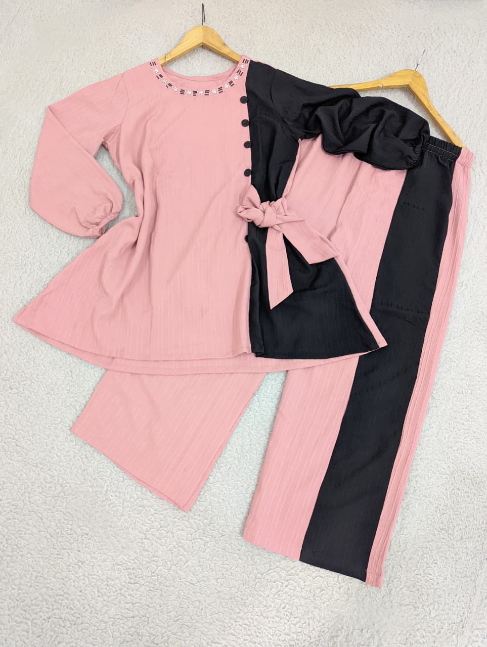 Chic two-piece set featuring a paneled peplum top with bow neckline detail and tailored trousers. Crafted from lightweight lining georgette for all-day comfort and elegance.