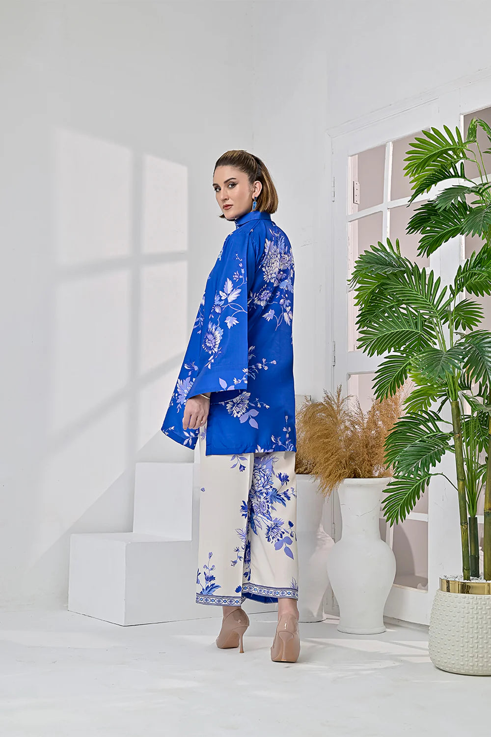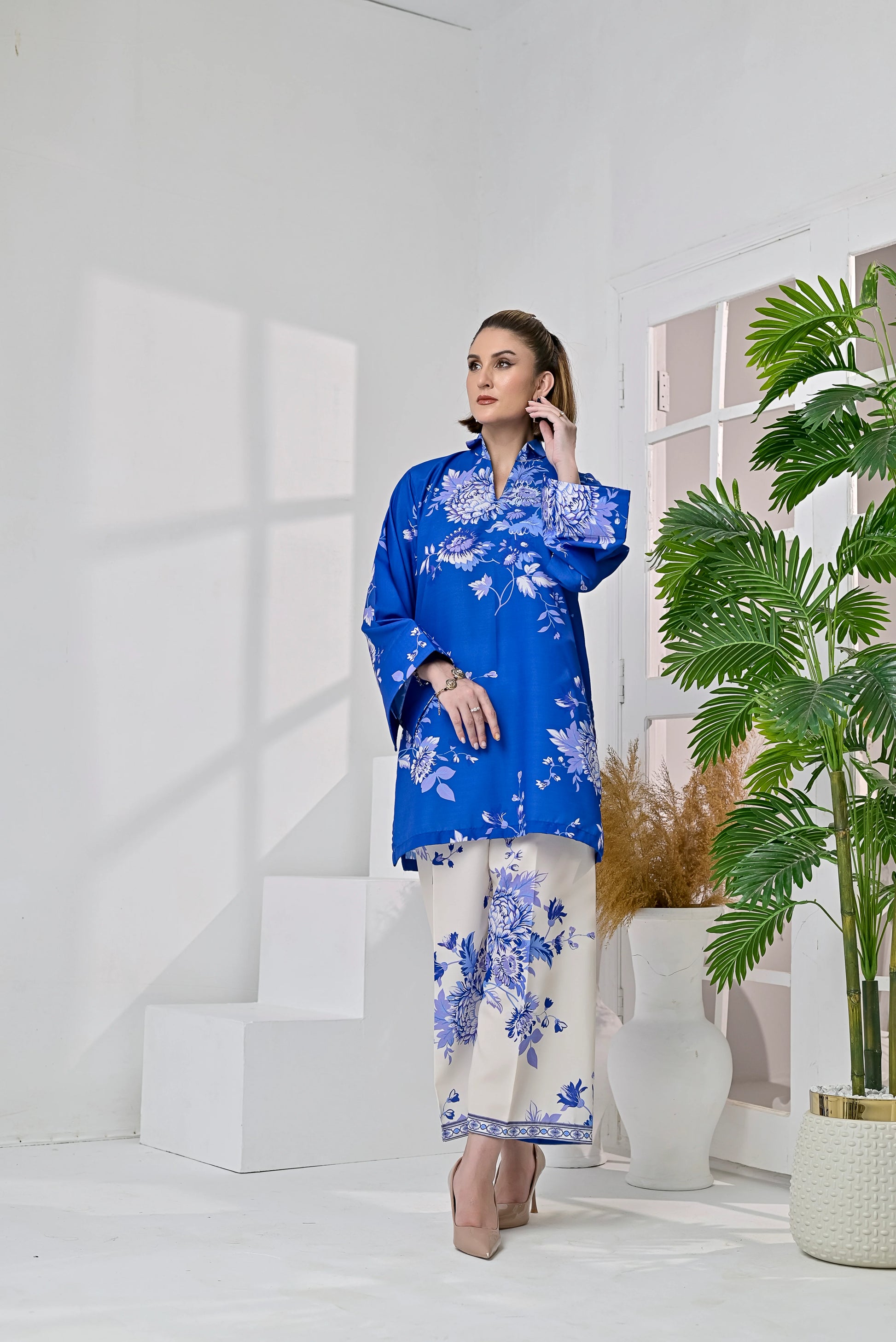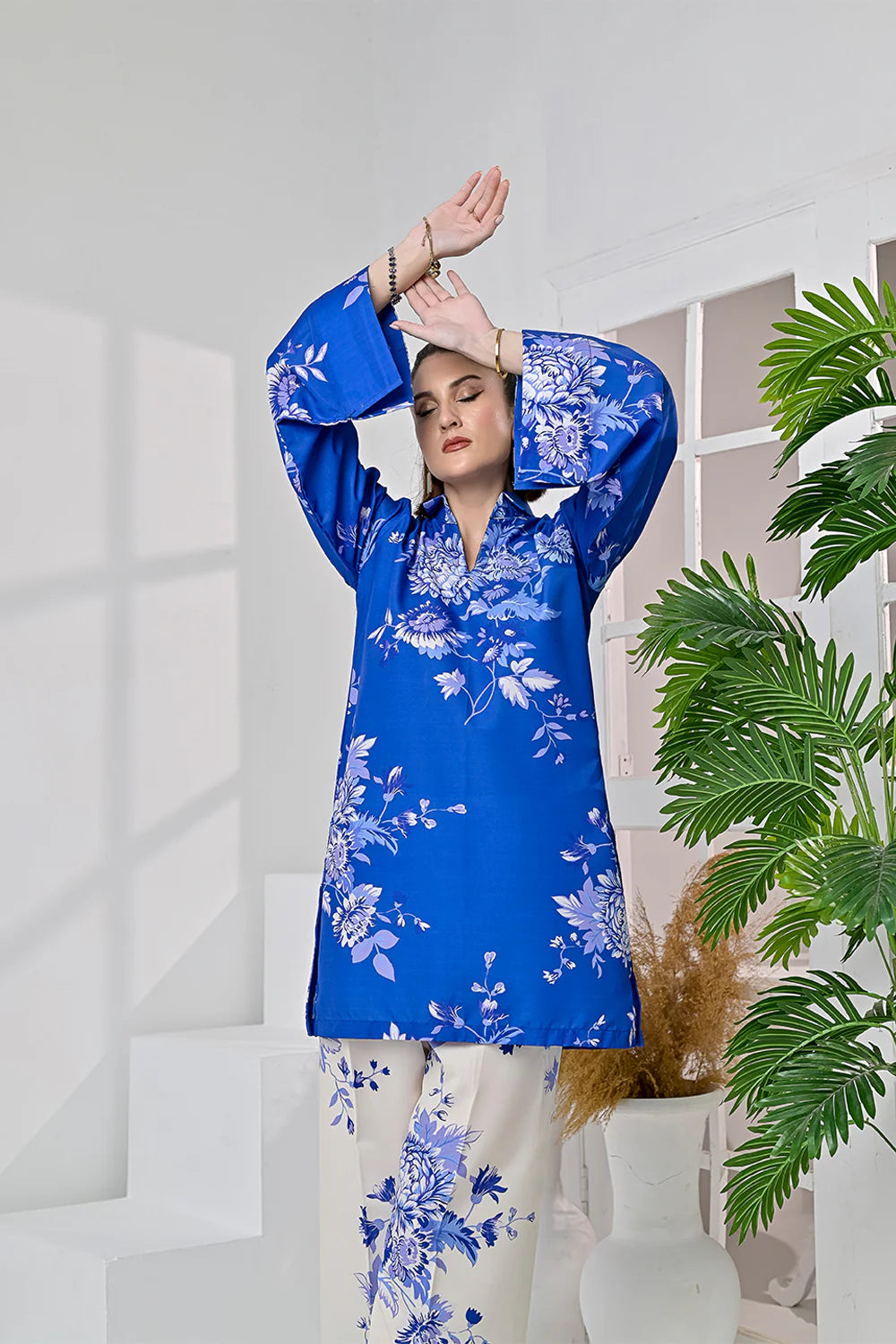 Royal Fantasy is a fresh take on floral with a bold twist. The cobalt blue shirt is covered in delicate, white-toned floral blooms, creating a striking contrast against the soft ivory base of the matching pants. Light, breathable blended raw silk fabric keeps it effortless, while the calm, floral composition adds quiet charm. Whether you’re heading out or staying in, this 2 piece stitched set makes looking put-together feel completely natural.