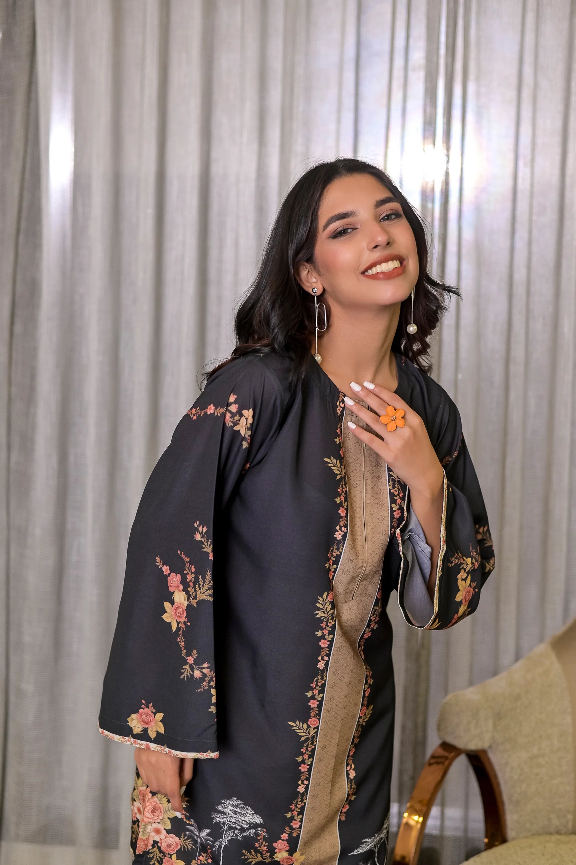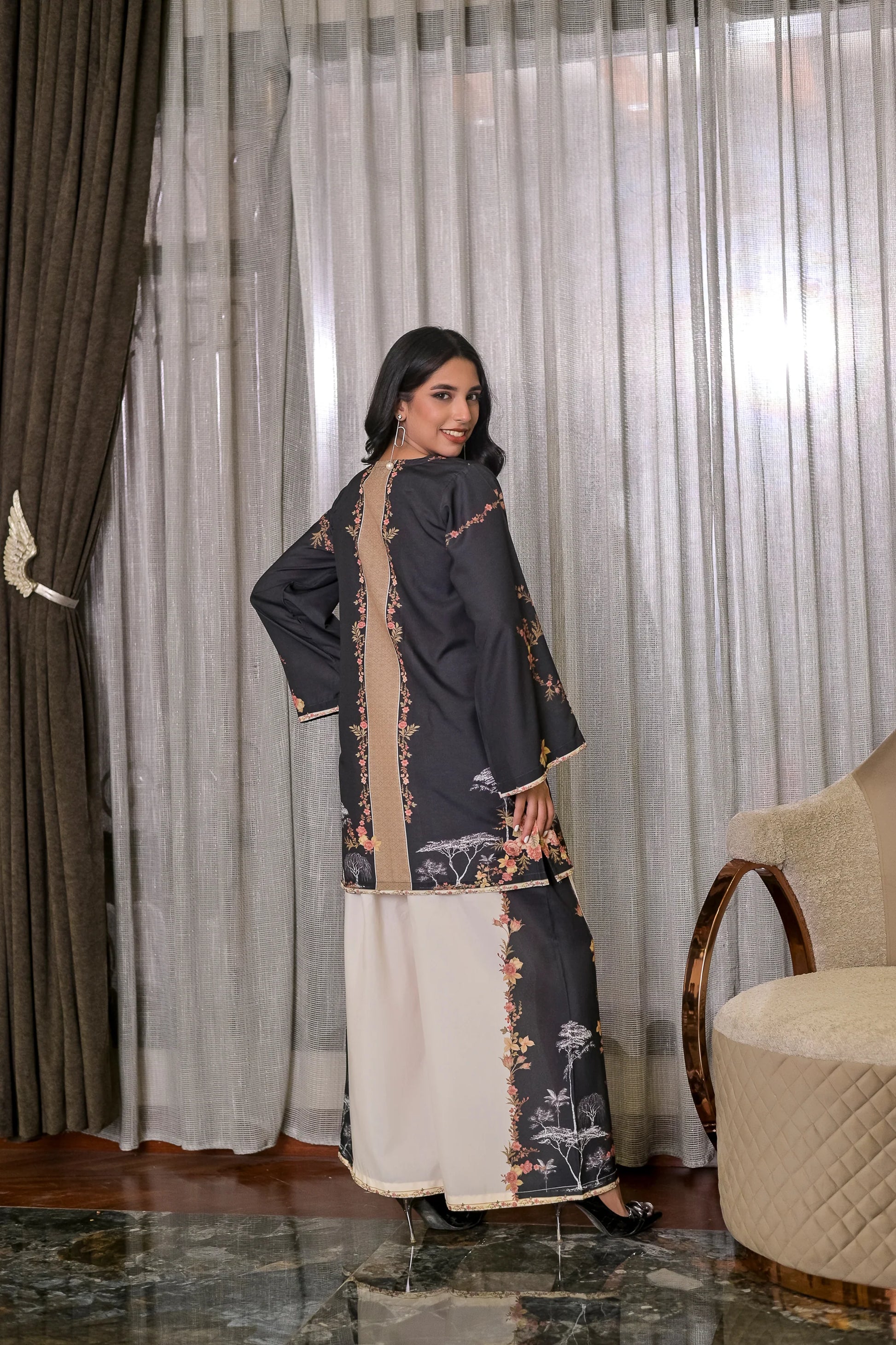 Sable Blossom combines timeless sophistication with delicate floral artistry, set against a rich black canvas highlighted by a soft beige panel. Crafted from lightweight blended crepe, this 2-piece stitched set features a straight-cut shirt with full sleeves and wide trousers adorned with matching floral accents. Elegant, versatile, and effortlessly chic—perfect for both daytime gatherings and evening occasions.