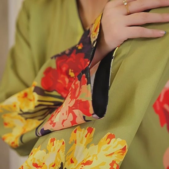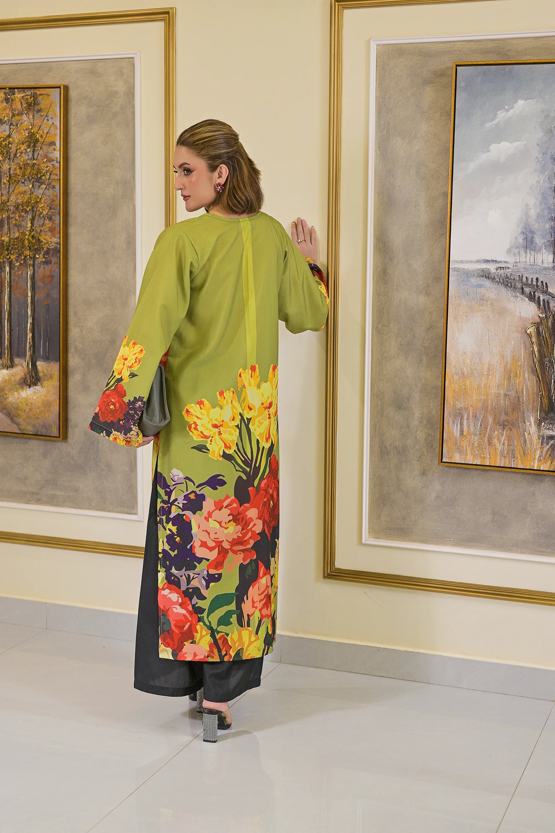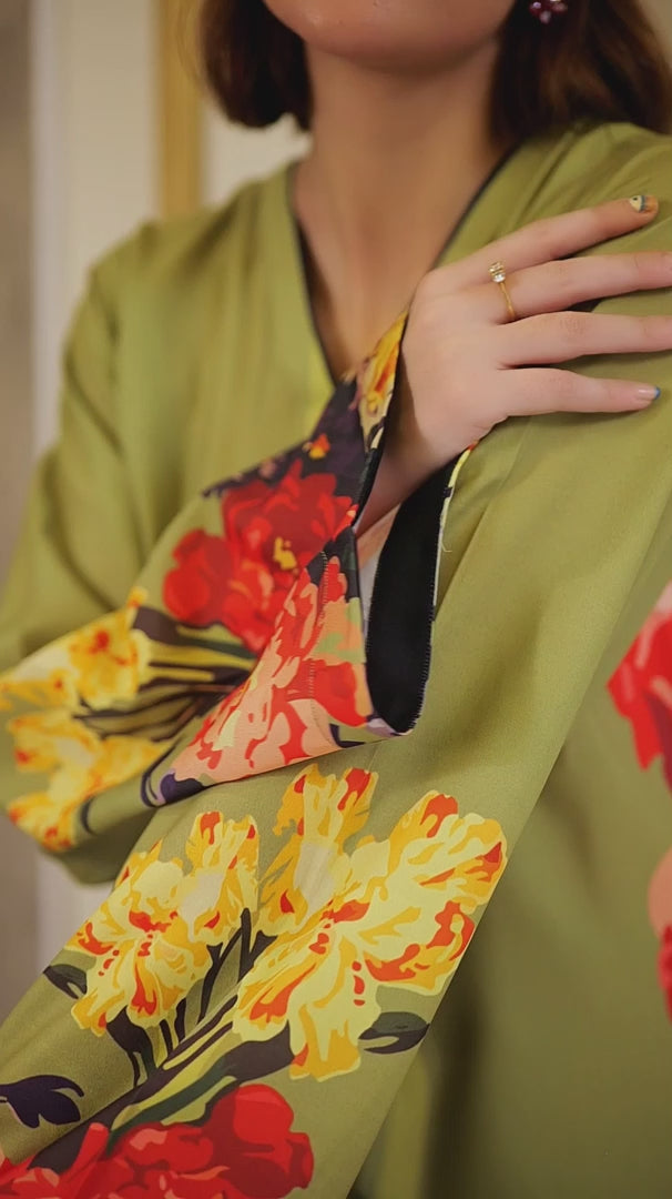 An elegant two-piece set combining soft olive-green with vibrant sunset florals. Made from lightweight blended raw silk, it features a straight-cut shirt with full sleeves and matching dark trousers. Perfect for a refined, contemporary look that transitions seamlessly through your day. a straight-cut shirt with full sleeves and dark-toned trousers for a balanced finish. Fresh, modern, and effortlessly chic—ideal for making a graceful statement in everyday wear.