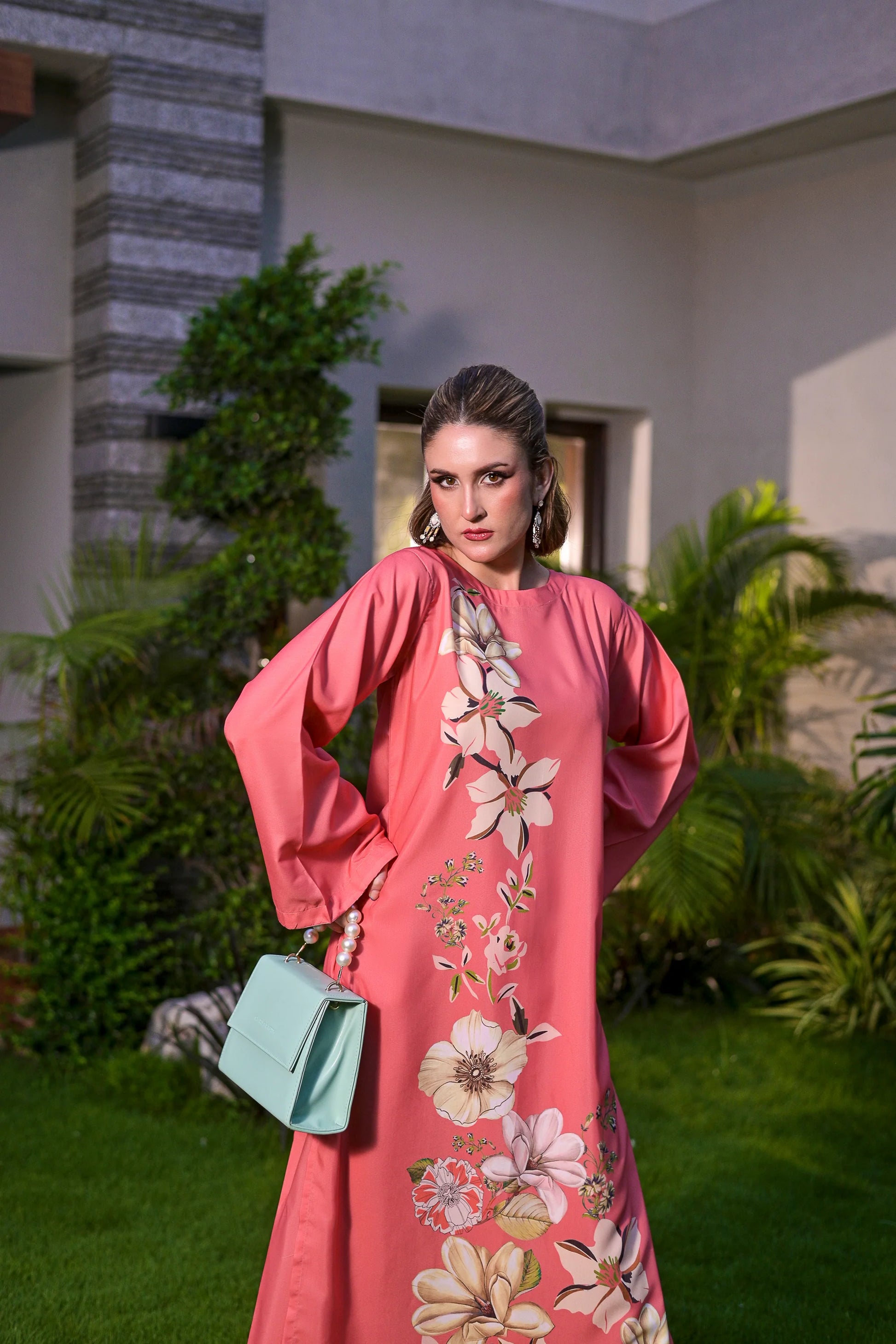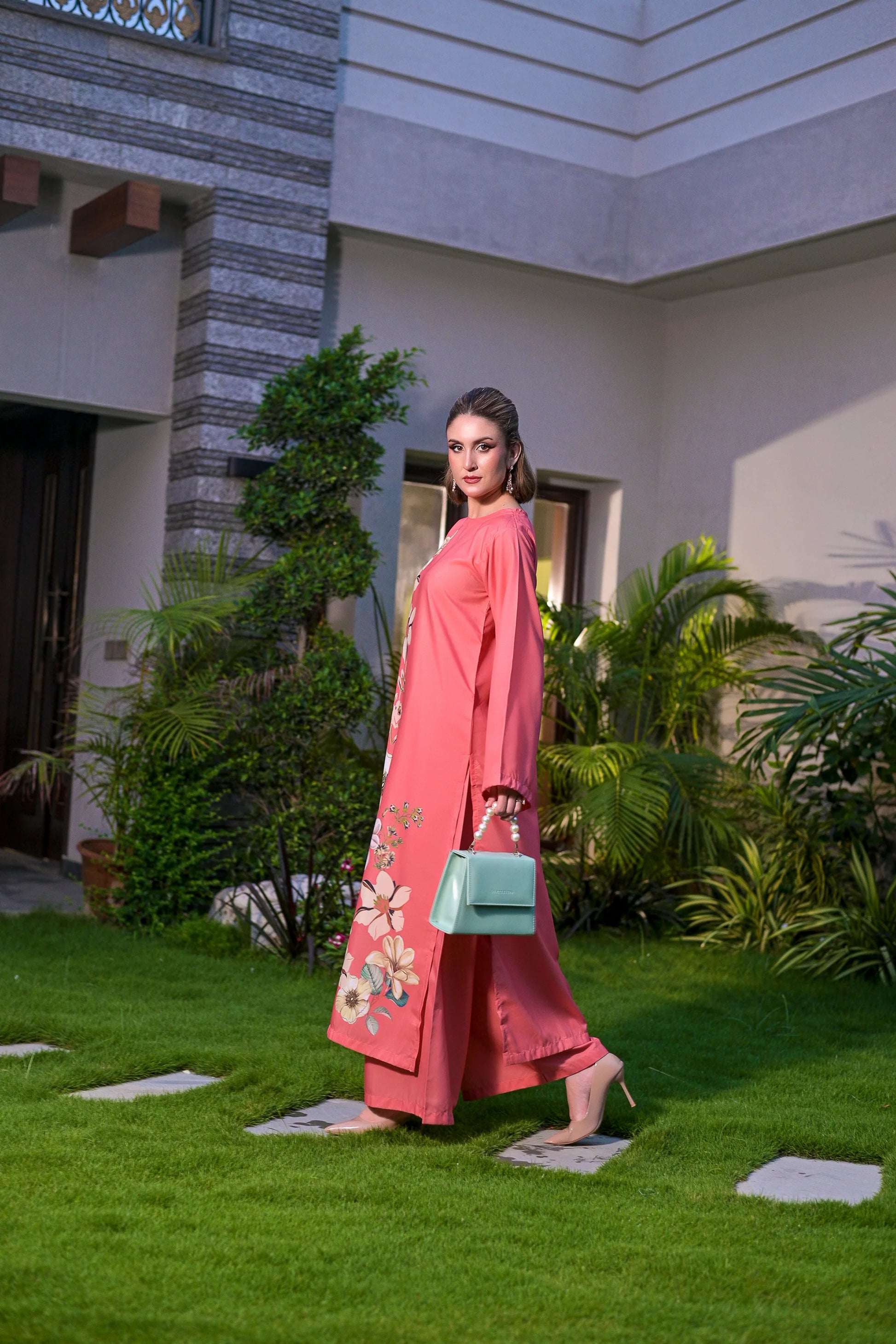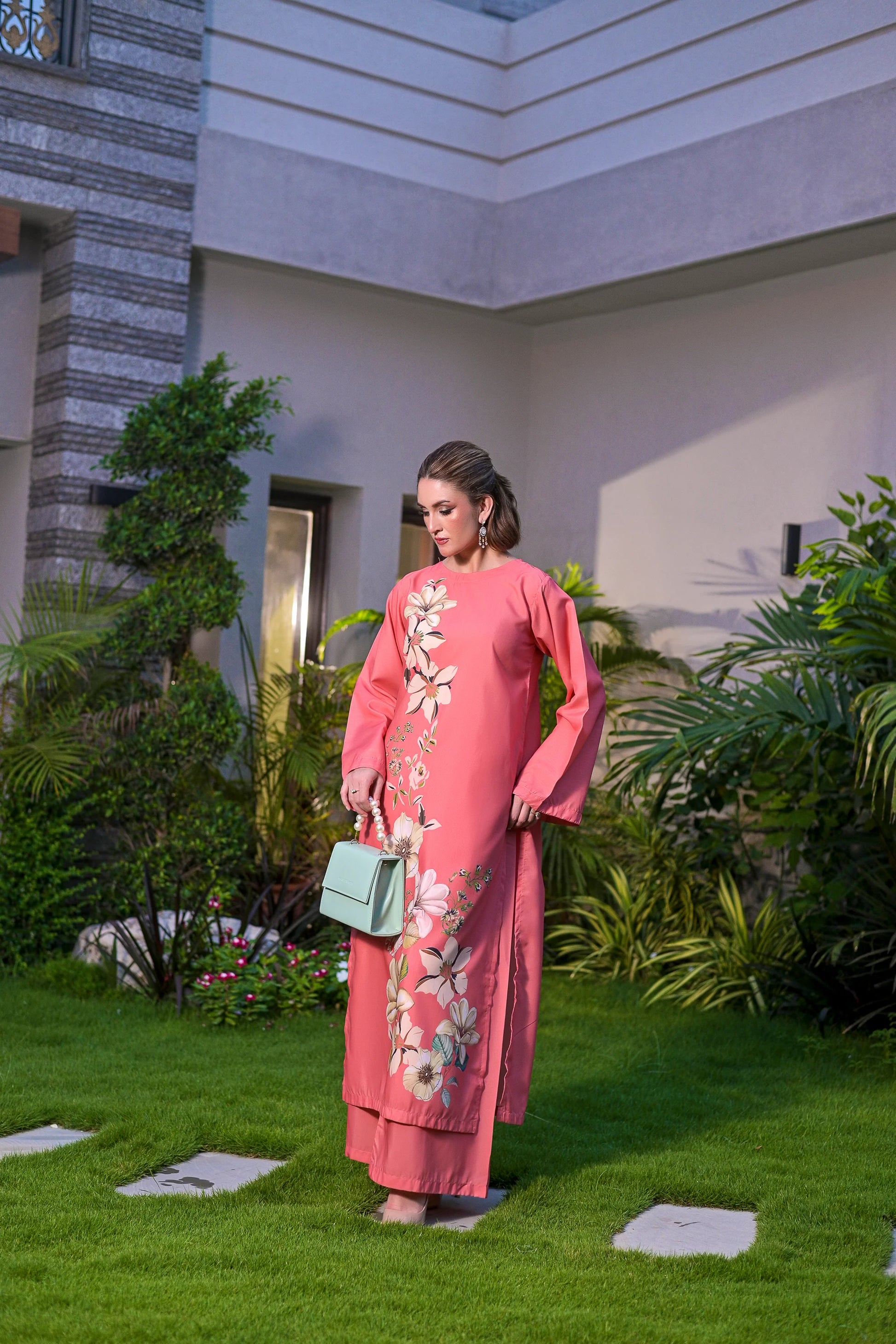Sepals embraces feminine charm with its coral-pink base and delicate floral motifs cascading along the front. Tailored from lightweight blended raw silk, this 2-piece stitched set features a straight-cut shirt with long sleeves and matching trousers for a graceful, coordinated look. Soft, breezy, and effortlessly elegant—ideal for adding a touch of floral sophistication to your everyday style.