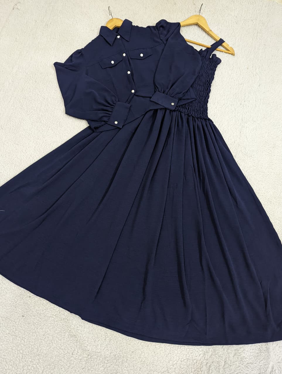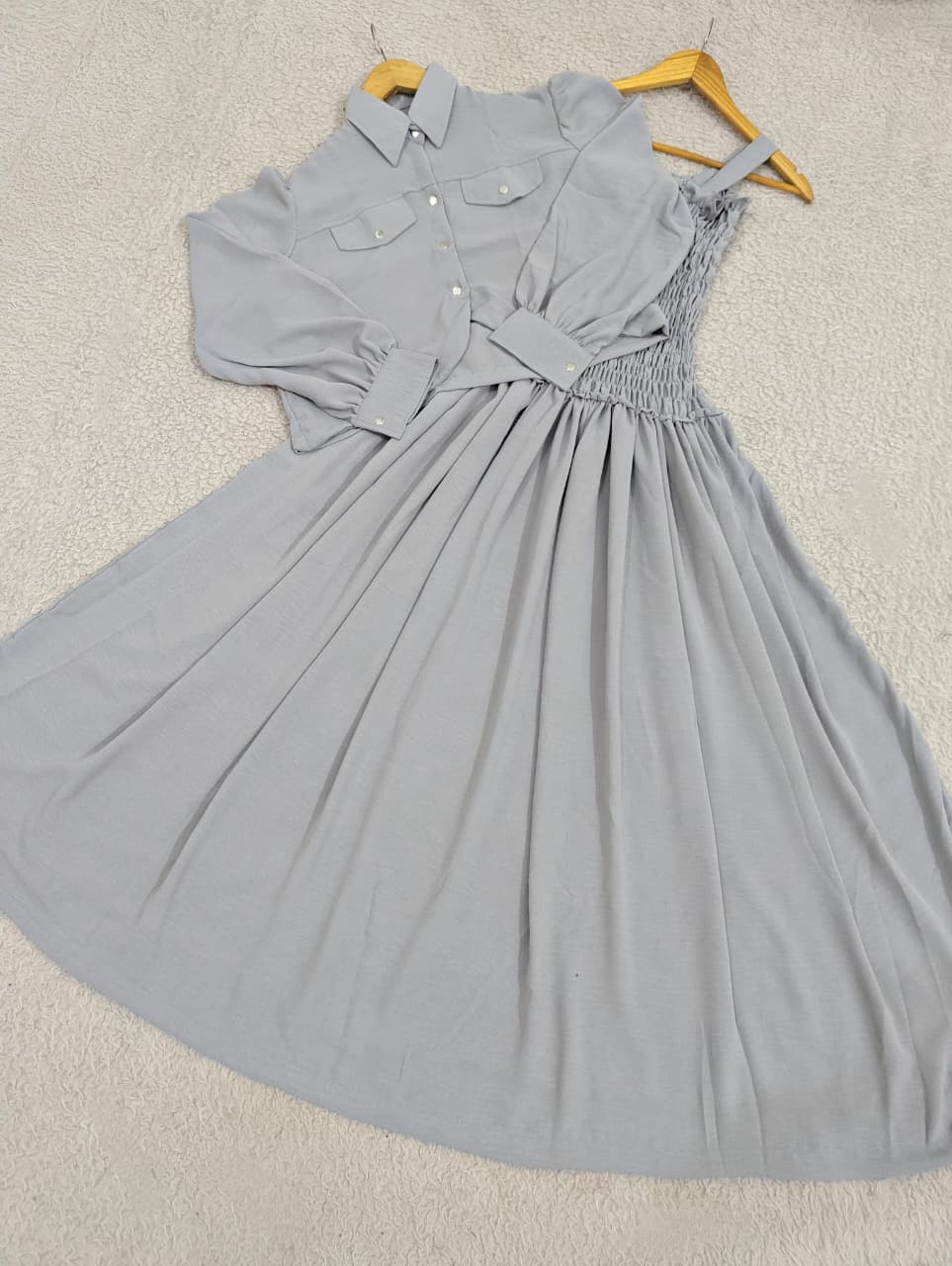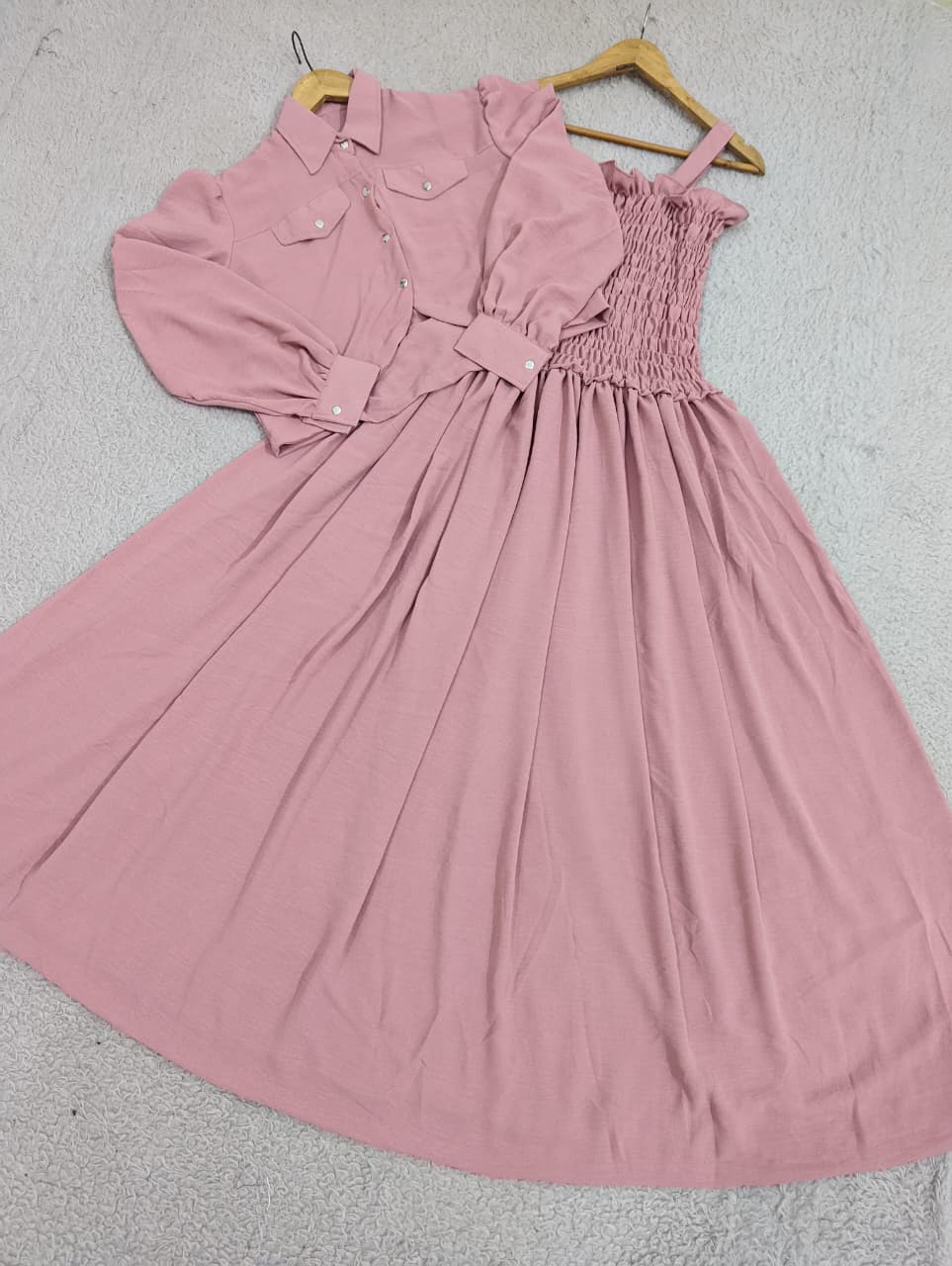 This Solid Smoking Coat Maxi features a graceful frock with an elastic detailed top, offering a comfortable yet stylish fit. Crafted from imported georgette fabric, it includes a solid double pocket coat that adds both functionality and a sleek, modern look. Perfect for occasions that call for effortless elegance and refined comfort.